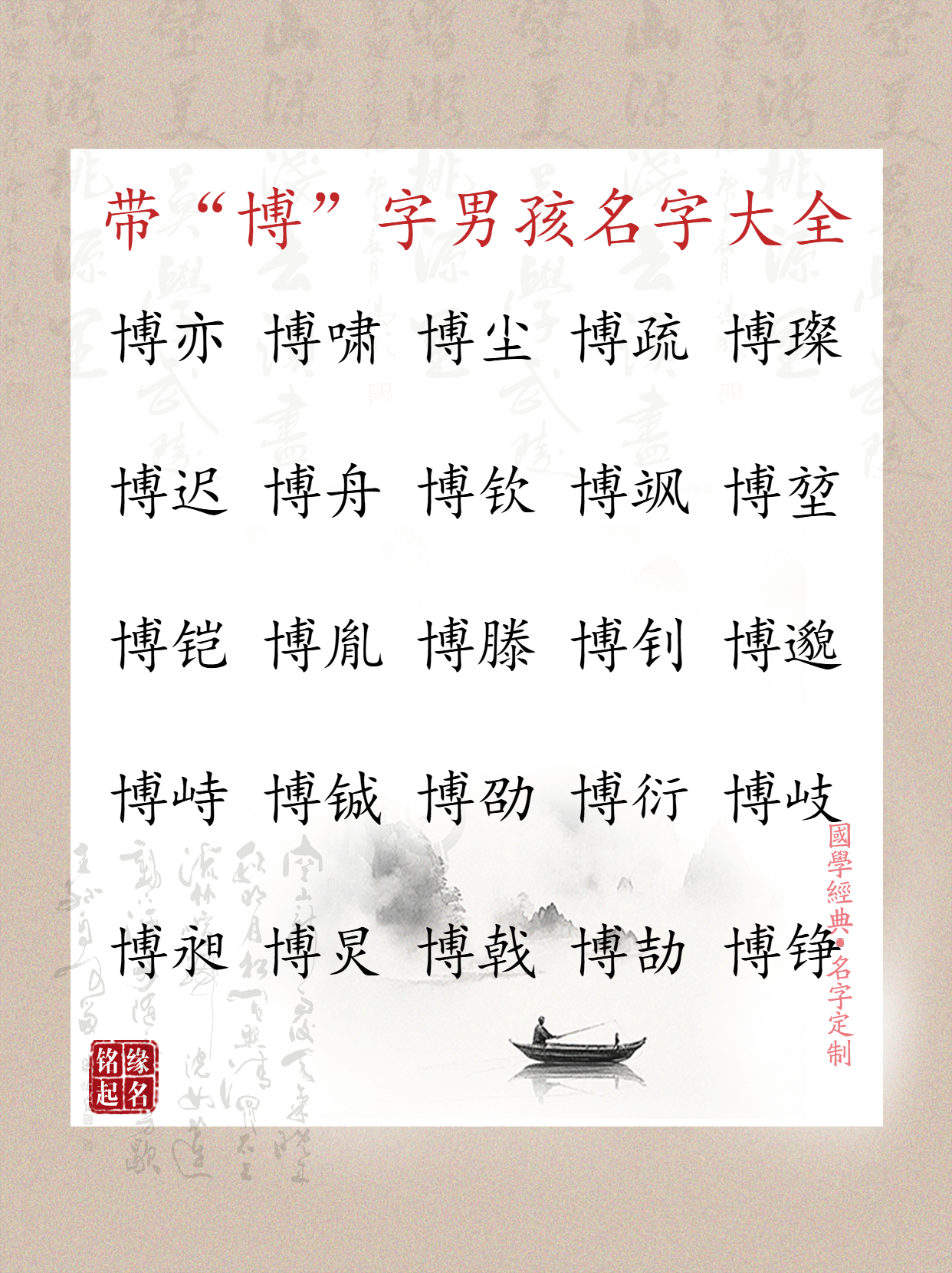 - **五行属性**:“博”字五行属水。水具有灵动、包容的特性,象征孩子思维活跃,有很强的适应能力和包容心。